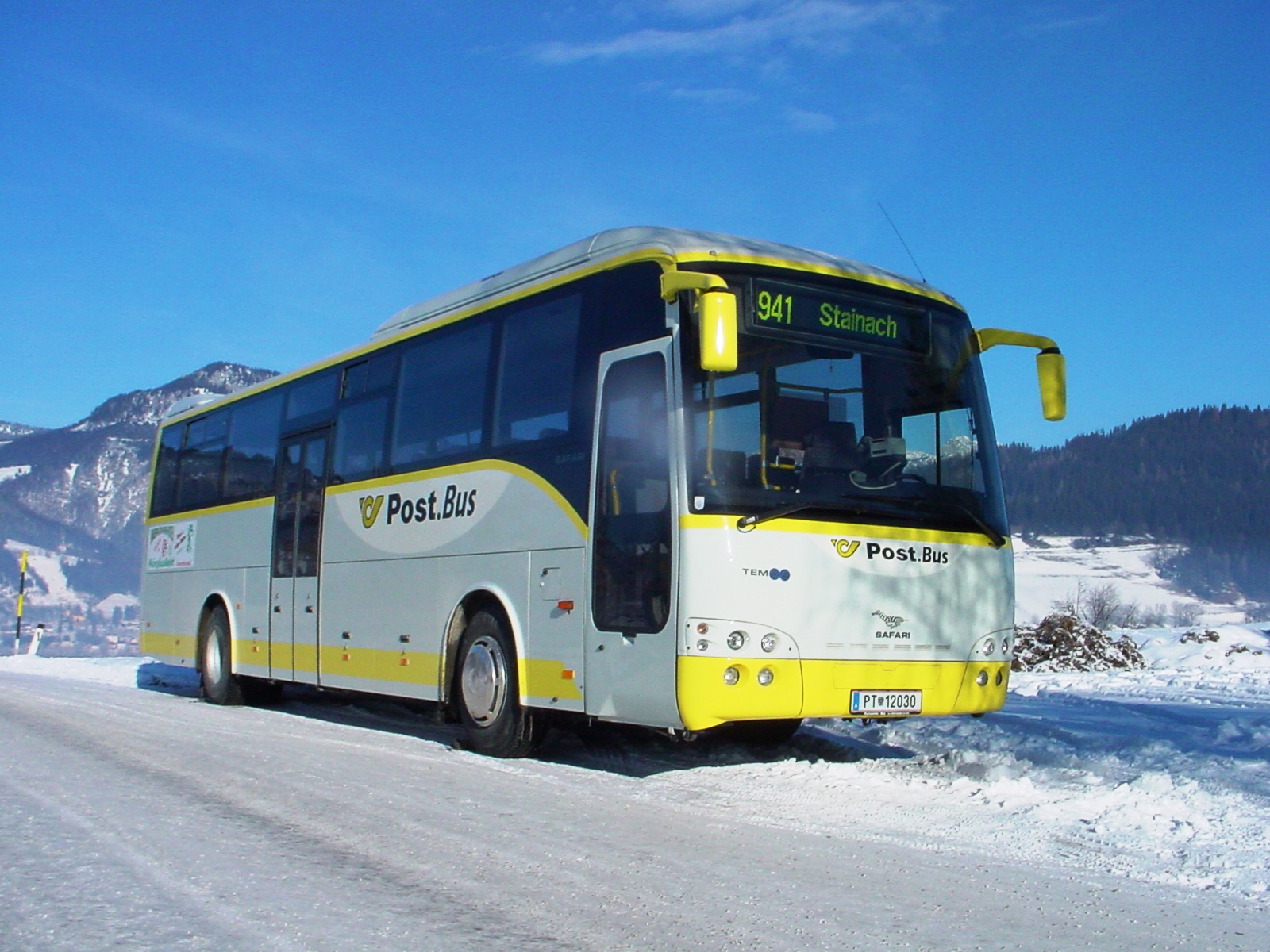 Postbus PT 12030 in Irdning während einer Pause an einem herrlichen Wintertag. Fotografiert Ende Dezember 2003. Dieser Postbus verkehrte zwischen Stainach und Donnnersbachwald.