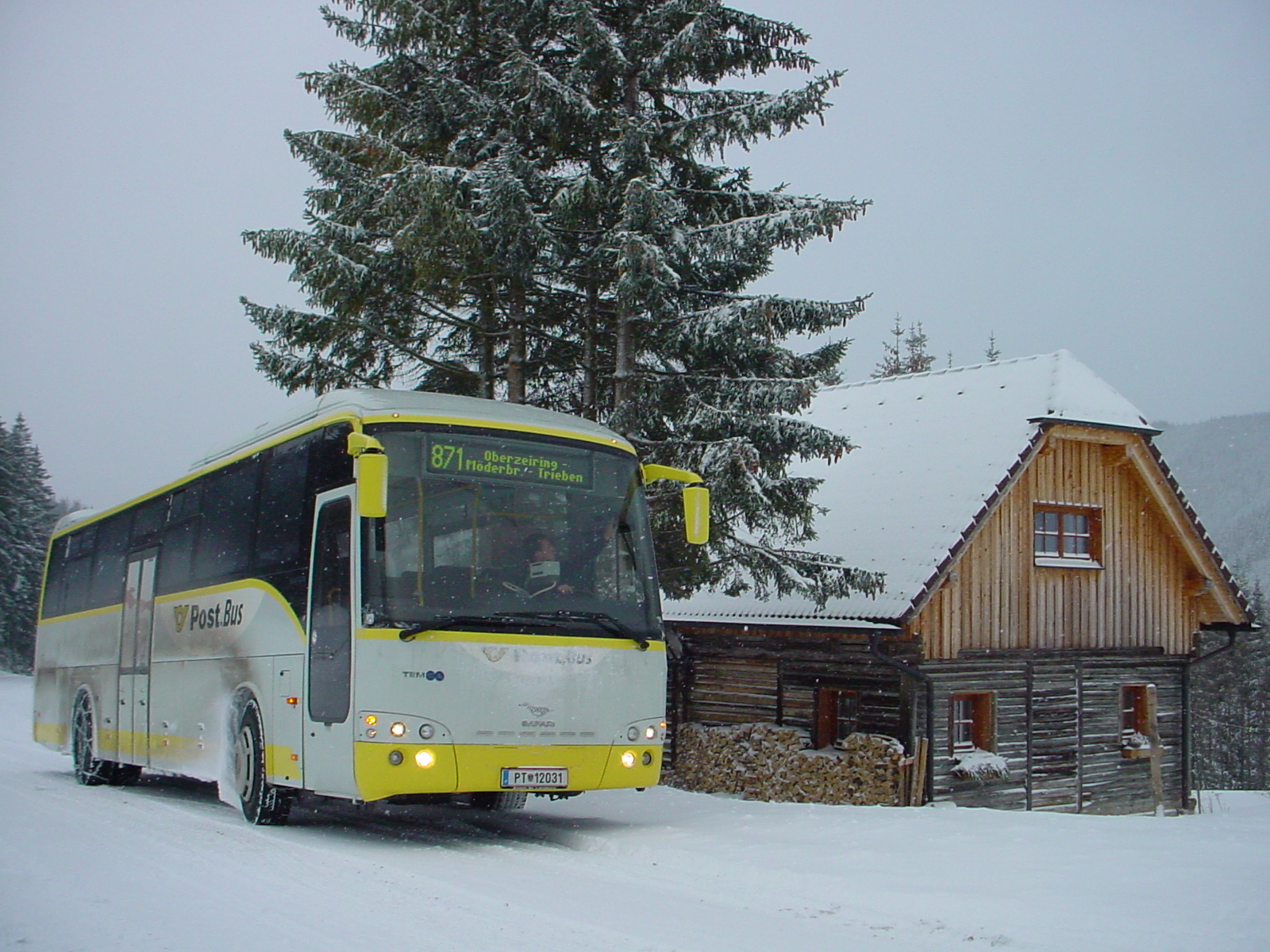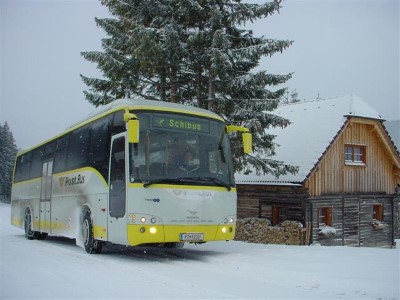 Postbus PT 12031 auf der Kaiserauer Landesstraße bei einer Skihütte anlässlich einer Leerfahrt von Trieben nach Admont.