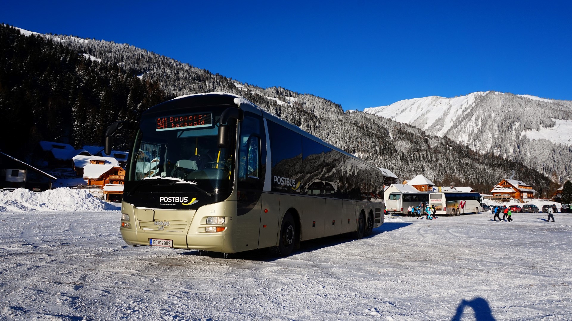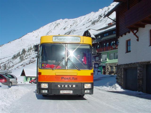 Postbus BD 14560 ist hier auf der Planneralm (Donnersbach) bei strahlendem Winterwetter zu sehen. Der Bus verkehrte zwischen Stainach und Planneralm im Skibusverkehr in der Saison 2002/2003.