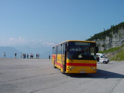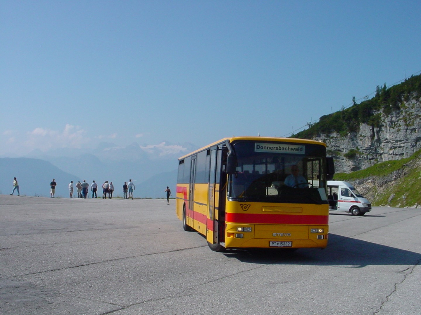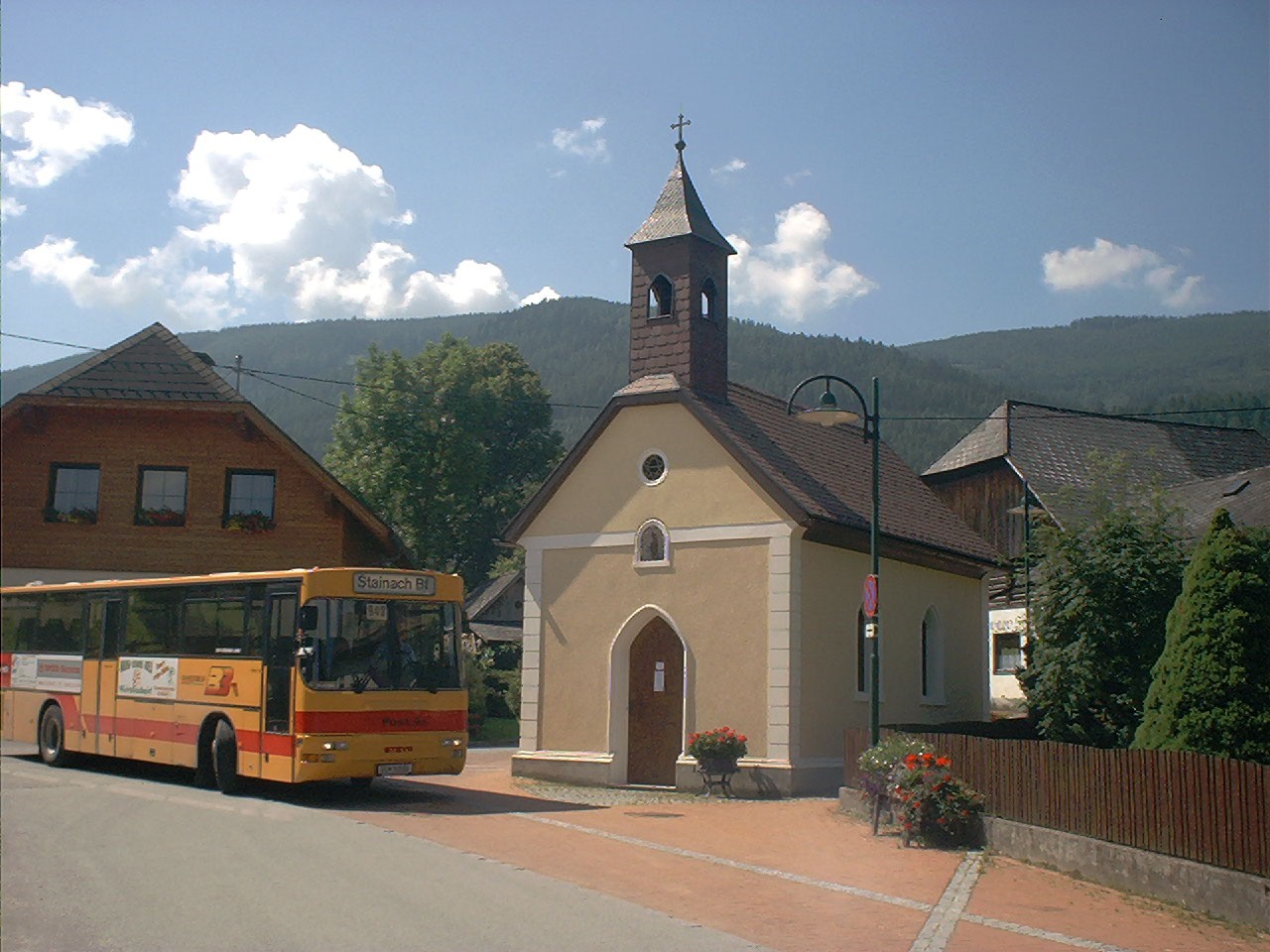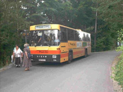 Postbus in Frauenberg (St. Marein im Mürztal) im August 2001 (hier zu sehen die Endhaltestelle => Bus muss hier zurückschieben (ca 200 Meter um umdrehen zu können). Diese Linie wird nur an Sonn- und Feiertagen im Sommer bedient.