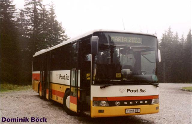 PT 15315, ein SETRA S315 UL ist hier auf dem Weg nach Mariazell am Preiner Gscheid (kommend von Neunkirchen) zu sehen. Diese Fahrten werden aktuell nicht mehr von Postbus durchgeführt, da das Paket Neunkirchen an einen privaten Unternehmer ging.