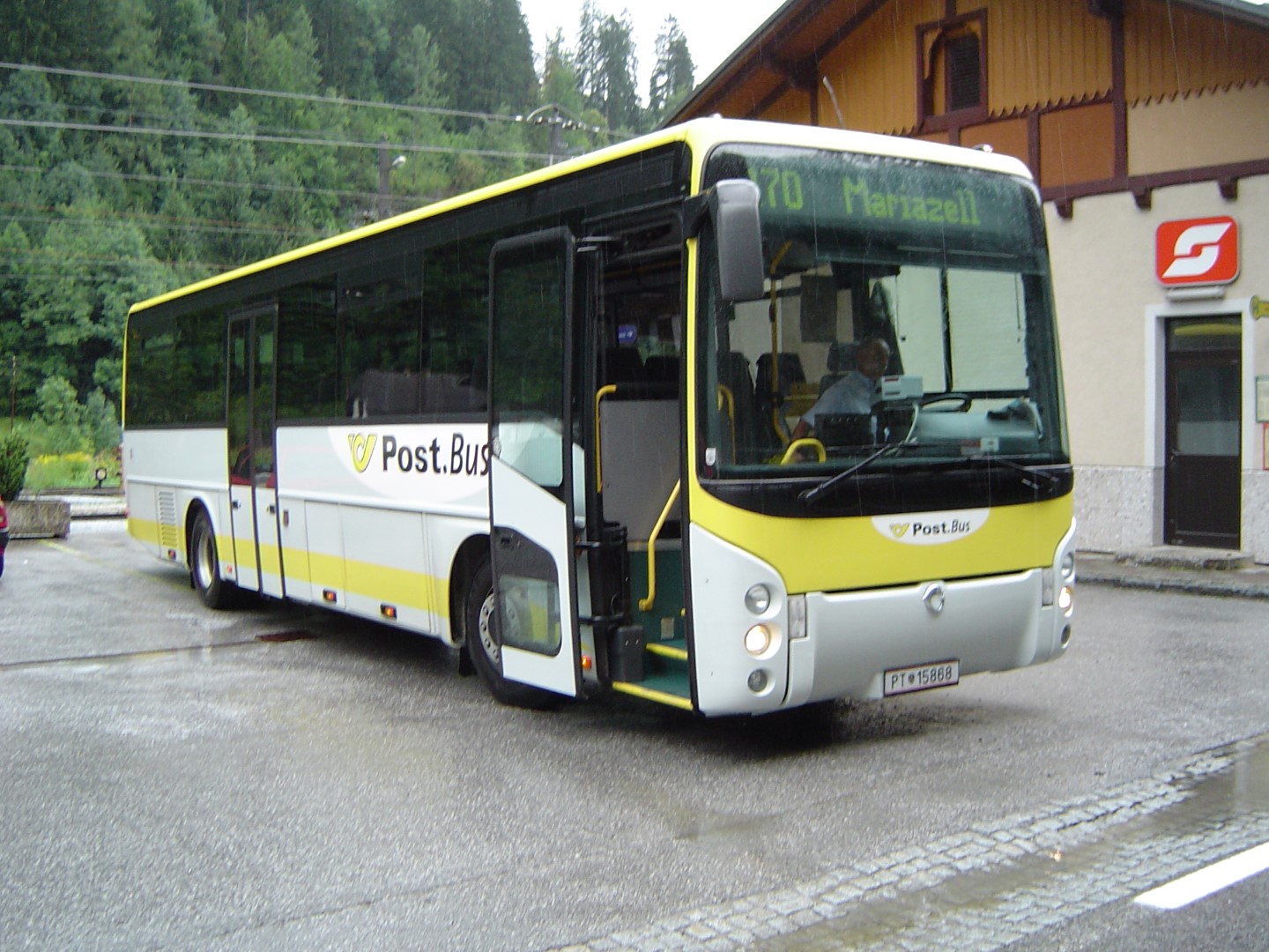 Postbus aus Mariazell (Bruck/Mur) hier bei einem Kurs welcher nur an Samstagen in den Sommerferien bedient wurde, und zwar Linie 6672, Kurs 10 von Eisenerz nach Mariazell, eine 2 1/2 - stündige Fahrt. Das Foto entstand in Hieflau beim Bahnhof - PT 15868 . Mittlerweile wird dieser Kurs durch Anrufsammeltaxis bedient. Auch die Linie Eisenerz - Mariazell besteht nicht mehr.