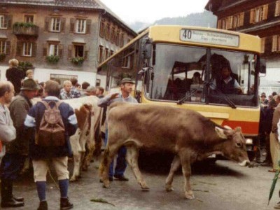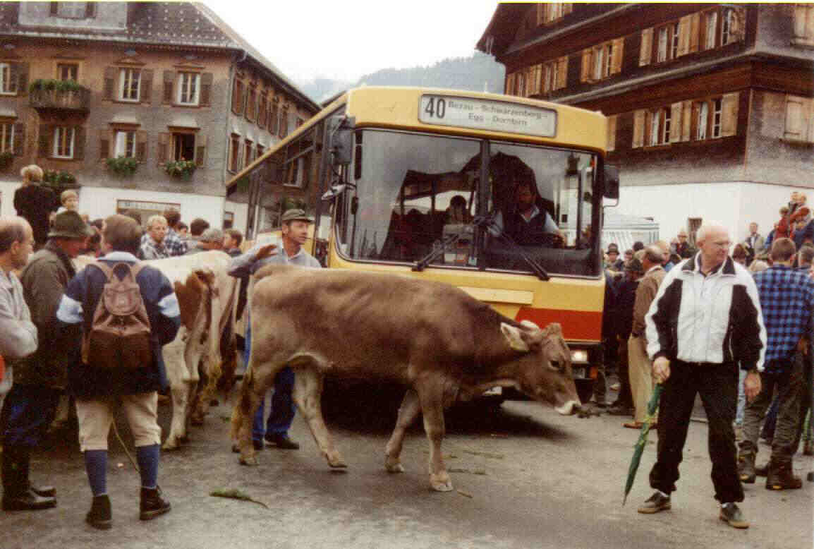 Postbus Volvo/Steyr in Schwarzenberg im Bregenzerwald beim Almabtrieb.