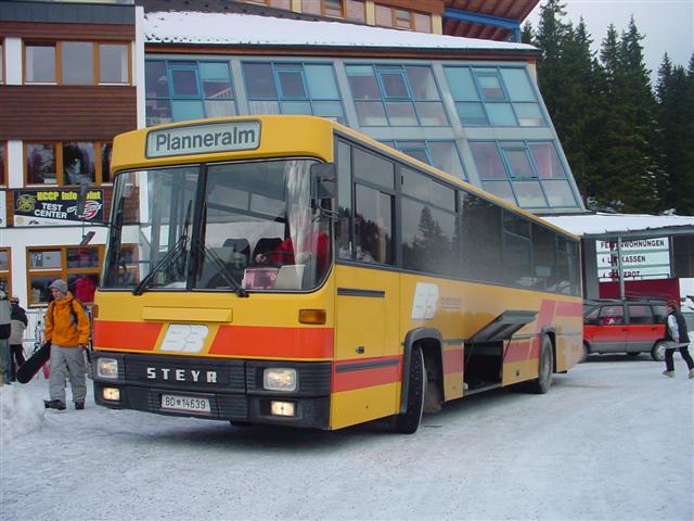 BD 14639 auf der Planneralm, zu sehen bei der Haltestelle Rotbühellift. Dies ist ein Post.Bus, der im Winter 2001/02 auf der Strecke Stainach - Planneralm verkehrte.