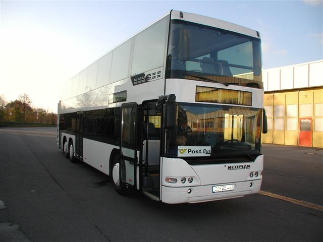Ein Vorführwagen der Postbus AG in Vorarlberg, hier zu sehen ein Neoplan Doppelstockbus.