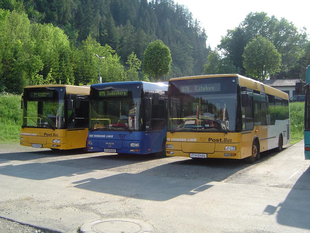Bild aufgenommen im Mai 2005 in Judenburg (Verkehrsstelle Abstellplatz). Das Foto zeigt die 3 ehemaligen Citybusse der Stadt Judenburg (PT 15469, PT 15404, PT 15405, alle MAN Göppel MN223)