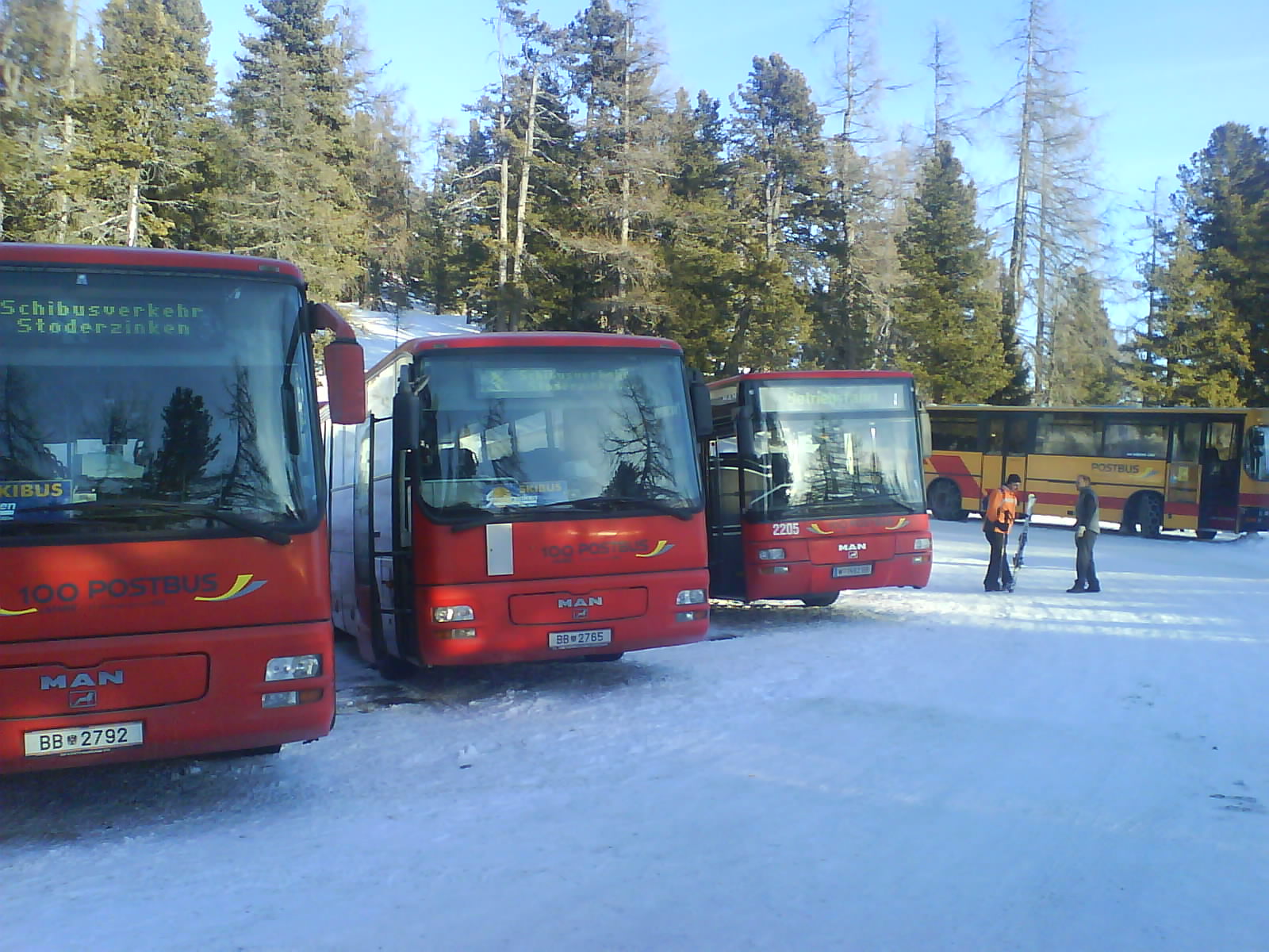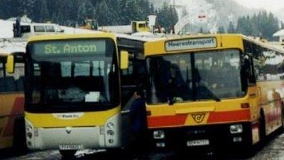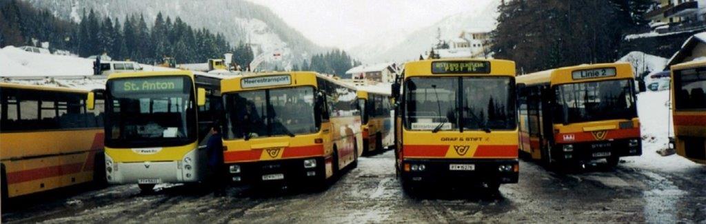 Postbusse am West - Terminal in St. Anton am Arlberg anlässlich der Ski-WM 2001. Zu sehen unter anderem ein Renault, Gräf & Stift und Steyr Busse.