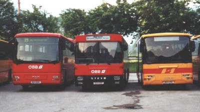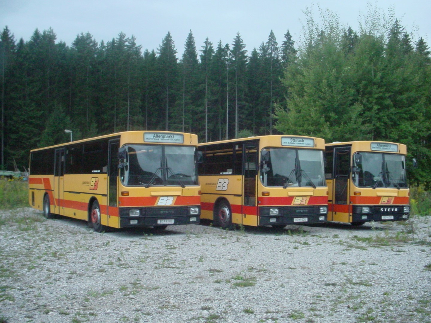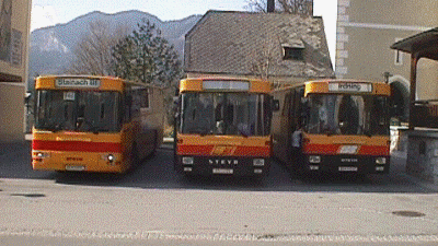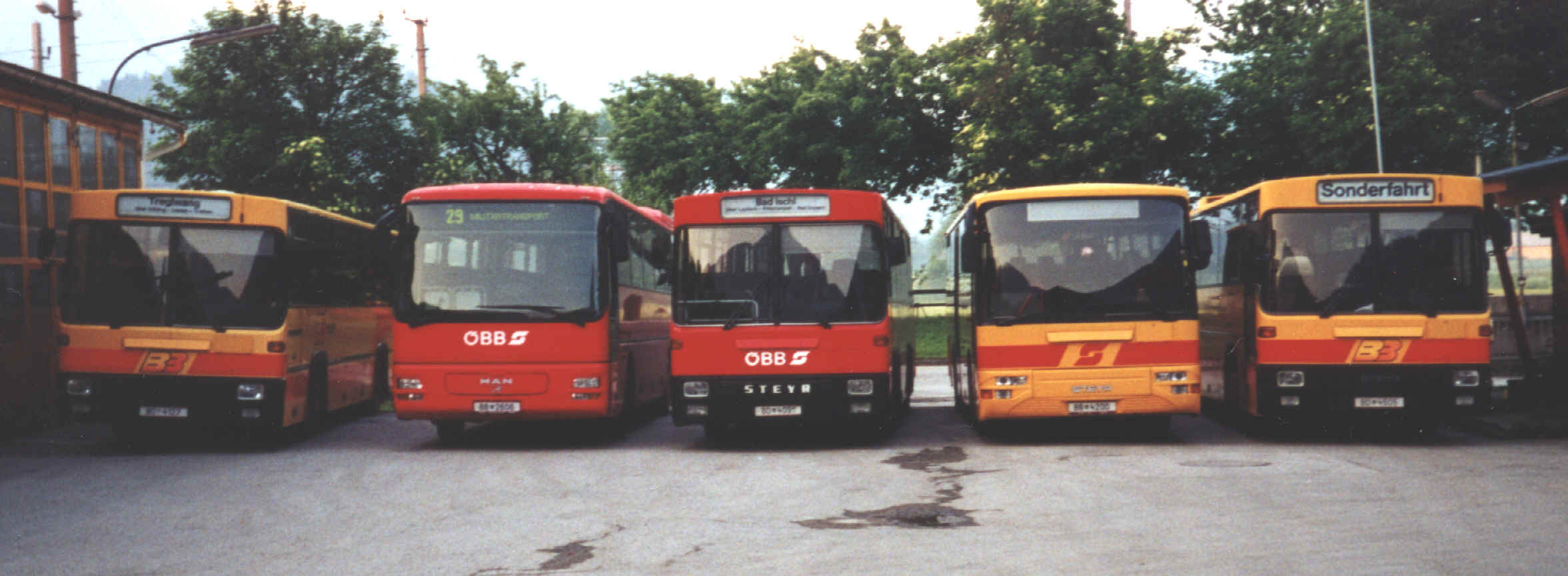 Einen Teil der Busflotte des BahnBus Stainach aus dem Jahr 2002 zeigt dieses Bild - eine bunte Mischung aus MAN ÜL 353, Steyr/Volvo und Steyr Bussen.