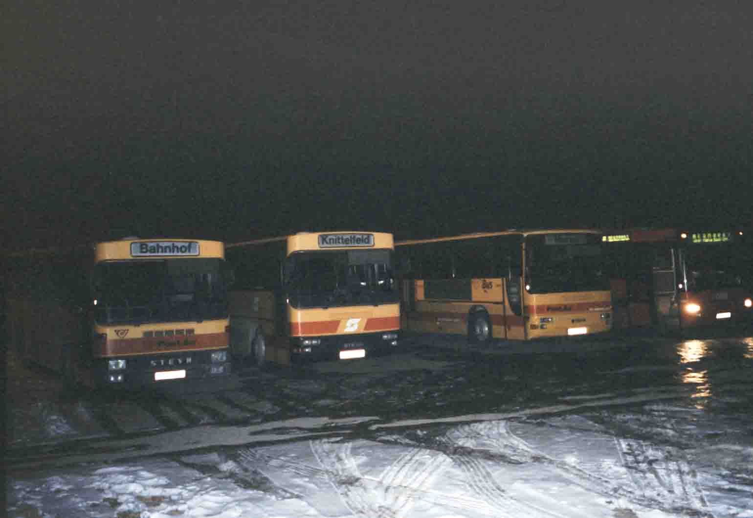 BahnBusse aus Stainach stehen hier in Irdning am Sportplatz. Das ist weil, der Parkplatz in Stainach bei der KWD gerade neu asphaltiert wird. Deshalb stehen alle 20-23 Busse in Irdning. Das Bild entstand im November 2003 - zu sehen unter anderem MAN ÜL353 Busse, Steyr Busse und Steyr/Volvo Busse.