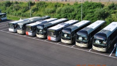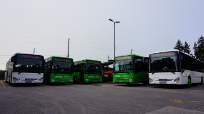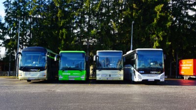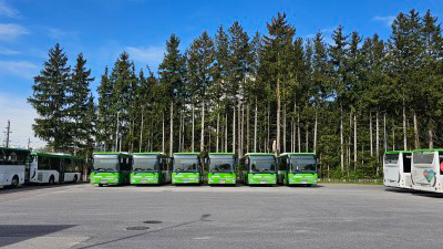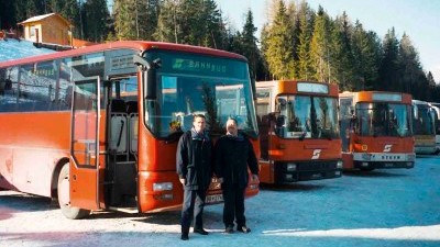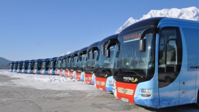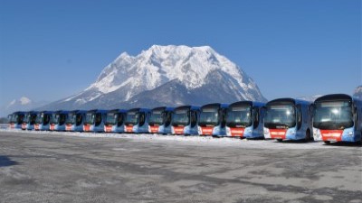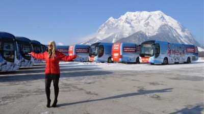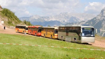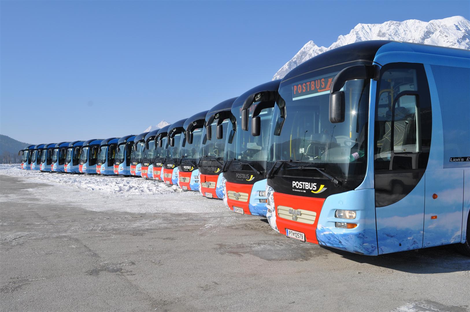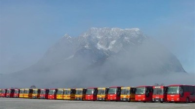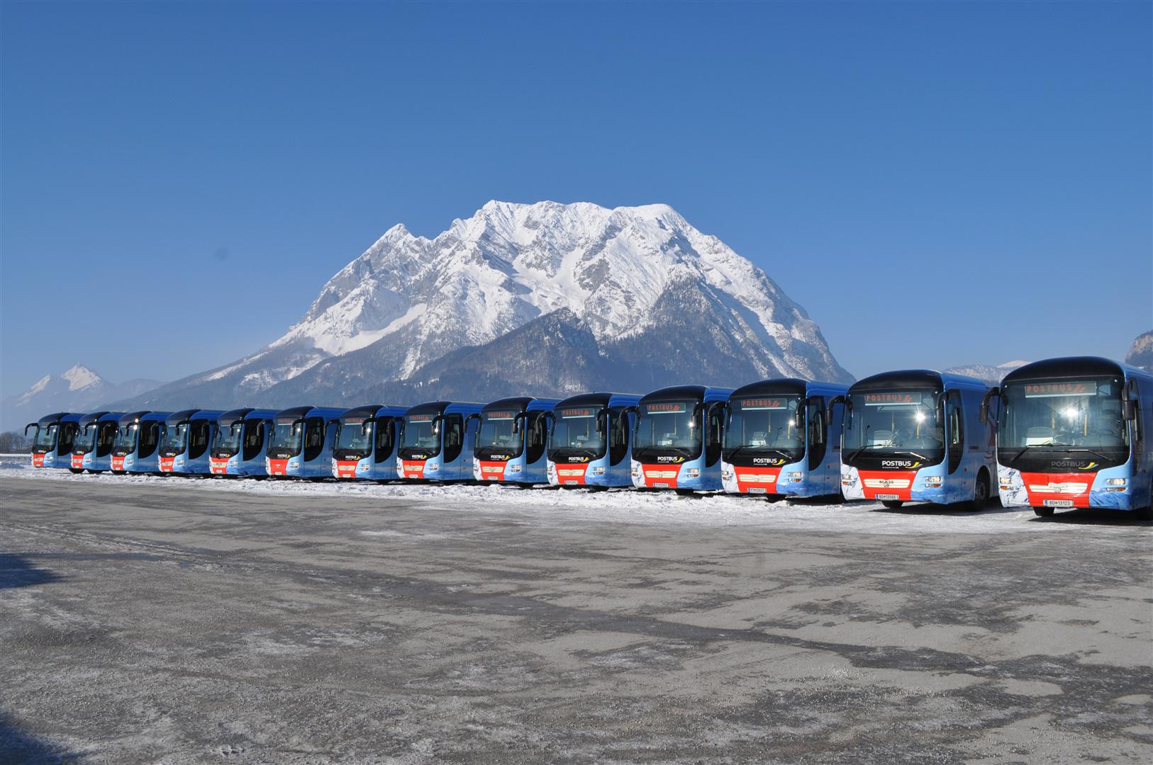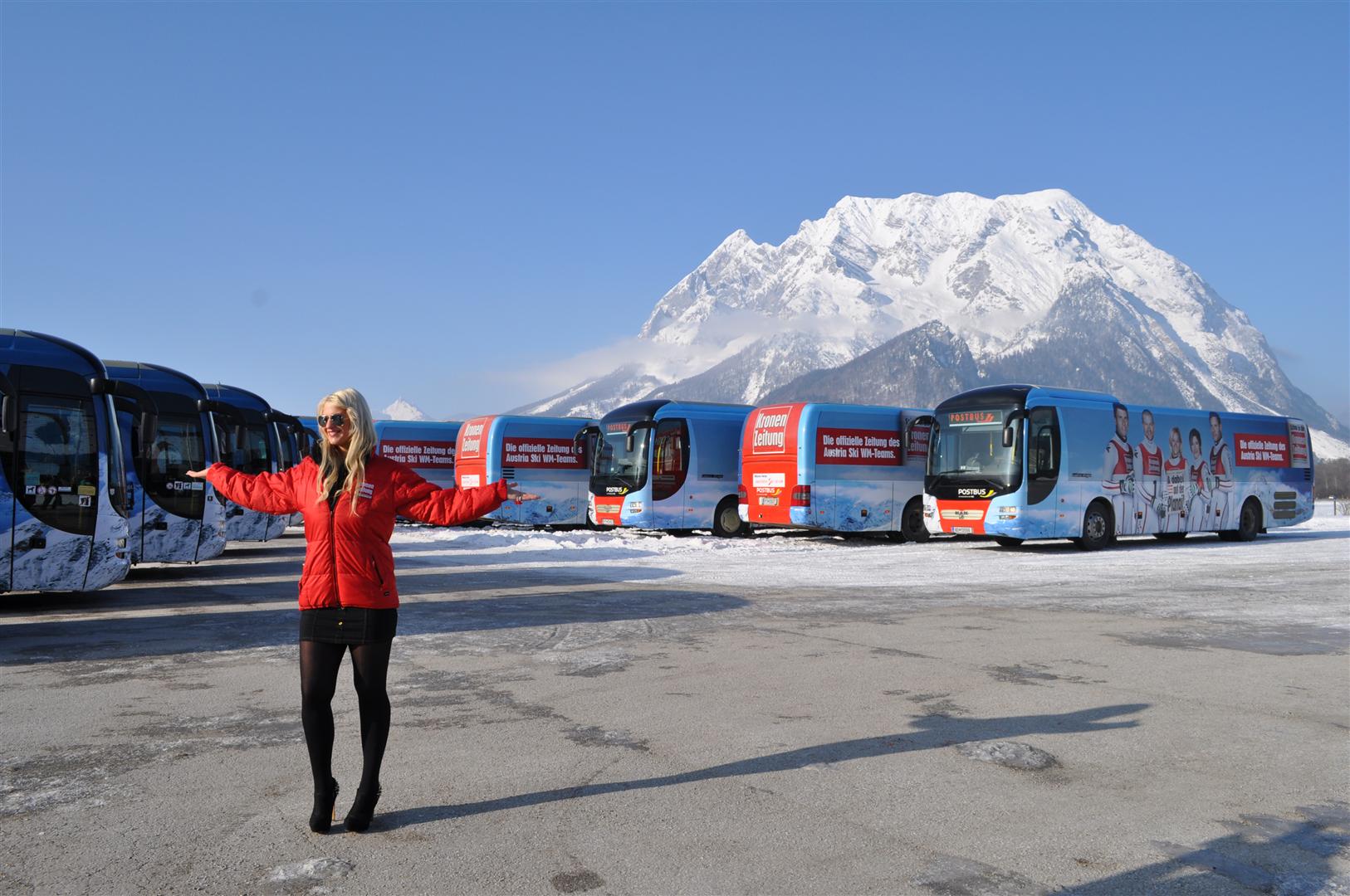 Am 26.1.2013 fand am Sportplatz Irdning das SKI WM 2013 Krone Foto Shooting der WM Busse statt. Hier sieht man die Flotte vor dem mächtigen Grimming aufgereiht.