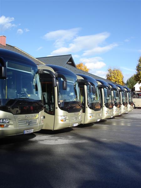 7 Busse der "neuen" Flotte der VS Stainach sind hier zu sehen. Insgesamt wurden 2006/2007 ca. 16 neue MAN Lion's Regio angeschafft. Hier wurden 7 Busse vor dem Bürogebäude der VL Mur-/Ennstal positioniert.