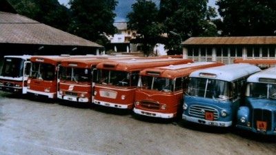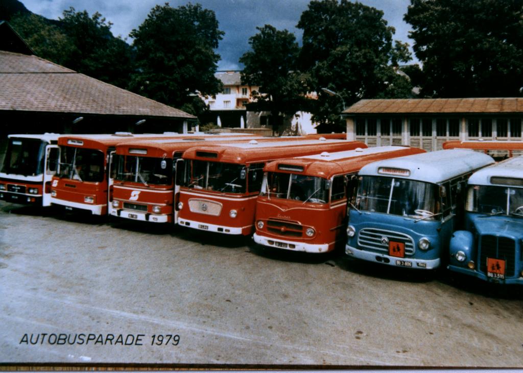 Einen Teil der Busflotte des Kraftwagensdienstes der Betriebsstelle Stainach aus dem Jahr 1979 zeigt dieses Bild - eine bunte Mischung aus SAURER, STEYR und MAN-Bussen.