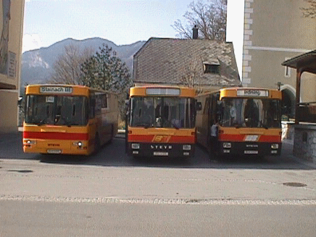 Foto aufgenommen am 21.4.2000 um 17:00 Uhr in Irdning am Hauptplatz. (Busse: Postbus (Volvo, Steyr); Bahnbus (Steyr); Postbus (Steyr)). Diese Haltestelle existiert in dieser Form nicht mehr, da es weiter westlich nun einen Busbahnhof gibt. Zudem musste diese Haltestelle immer im Retourgang angefahren werden.