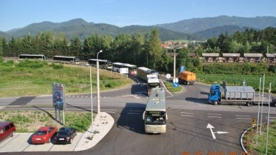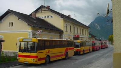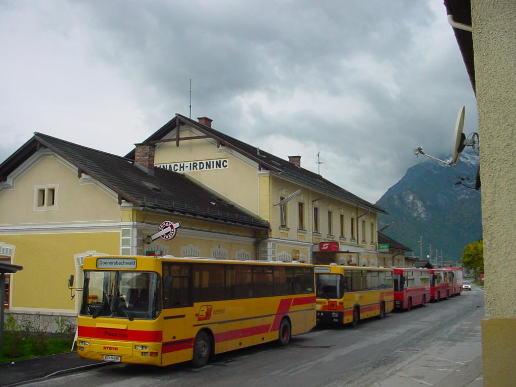 Diese Aufnahme entstand im Oktober 2002. 5 Busse warten vor dem Bf. Stainach auf die Abfahrt, wobei der 1. Bus ein Postbus (BD14996) mit Ziel Donnersbachwald ist und die restlichen 4 Busse BahnBusse sind und auf einen IC aus Richtung Salzburg warten um diesen im Schienenersatzverkehr Richtung Selzthal weiterzuführen.